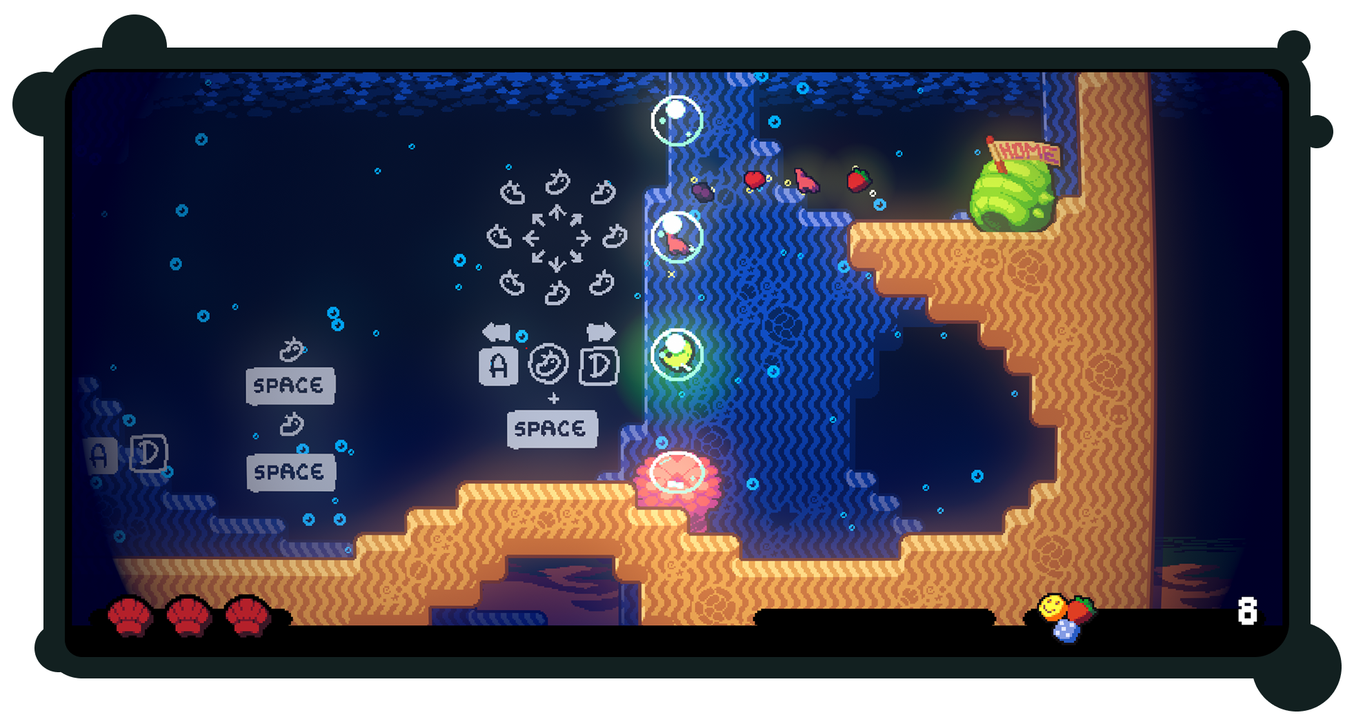 Swim, jump, and wiggle your way through a colorful underwater world, using rising bubbles to reach new areas and overcome tricky platforming challenges.